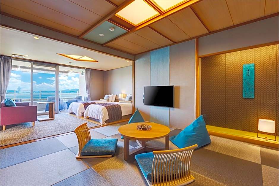 Features tatami (woven-straw) flooring and traditional futon bedding. The room comes with either a private open-air hot spring bath or a private indoor hot spring bath.
