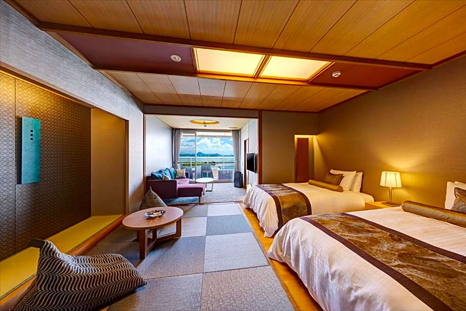 This twin room's special feature is the private open-air bath. The spacious twin room provides air conditioning, tatami, a terrace with lake views as well as a private bathroom featuring a bath. The unit offers 2 beds.